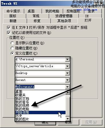 先安裝TweakUI工具,再選擇“開始→設(shè)置→控制面板”,雙擊“用戶接口自定義”圖標(biāo),單擊“打開”標(biāo)簽,選中“位置列”下的“自定義位置列”復(fù)選框。再在下面的文本框中選擇常用文件夾(也可以輸入自定義文件夾),(如圖4)所示。以后,就會(huì)在“打開”和“保存”對(duì)話框的左側(cè)窗格出現(xiàn)相應(yīng)文件夾按鈕,單擊后即可進(jìn)入,非常方便。